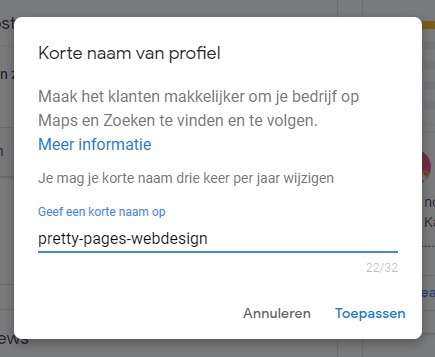 Zelf heb ik mijn review link aangepast in mijn bedrijfsnaam: pretty pages webdesign. Het resultaat is geworden: https://g.page/pretty-pages-webdesign/review?rc. Nog steeds een beetje lang maar wél herkenbaar omdat mijn bedrijfsnaam er tenminste in staat.