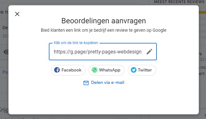 Nu kun je Google reviews gaan verzamelen. Je krijgt van Google de mogelijkheid om jouw link direct te delen via Facebook, WhatsApp of Twitter. Maar je kunt de link ook kopiëren en plakken in een (persoonlijke) mail aan jouw klanten en vragen om hun beoordeling van je dienst of product.