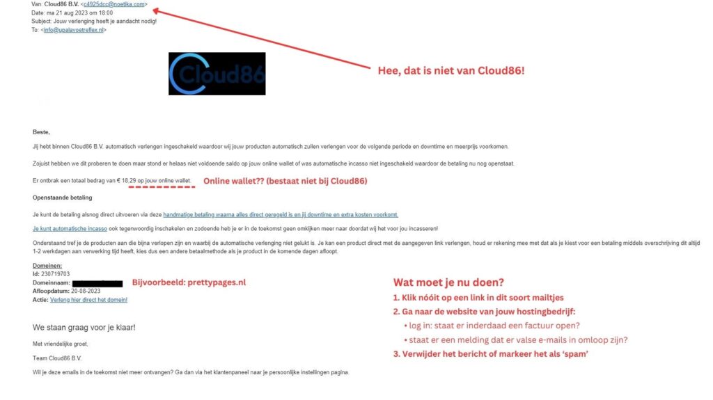 Momenteel wordt er veel nepmail uit naam van hostingbedrijven verzonden. In die mail wordt er gemeld dat er een betaling openstaat met betrekking tot jouw domeinnaam en/of hostingpakket of dat het niet is gelukt om het bedrag te incasseren. Je eerste reactie als je dit leest is : ik moet iets doen, want anders ben ik straks m’n website/webshop kwijt!