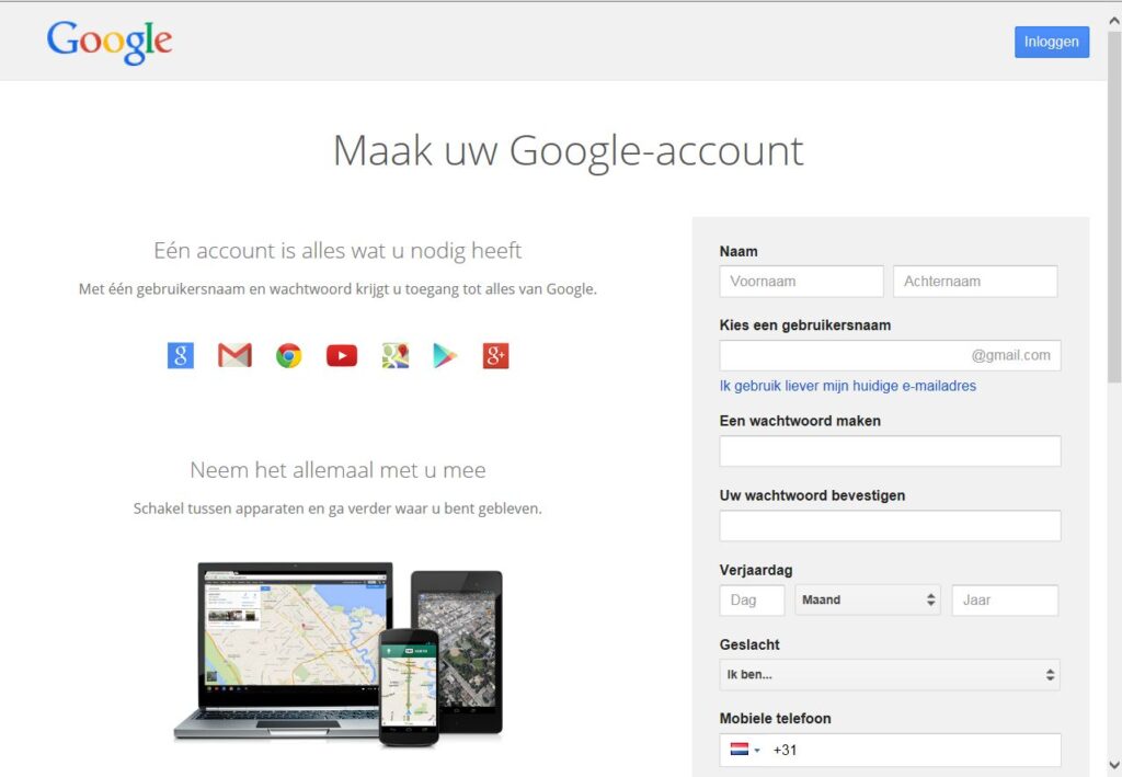 Als je nog geen Gmail hebt, moet je eerst een Google account (= Gmailadres) aanmaken.