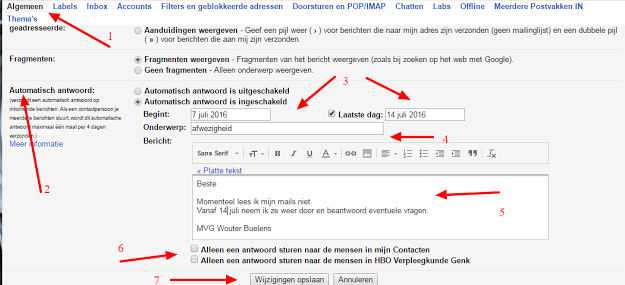 –> selecteer aan Automatisch antwoord is ingeschakeld