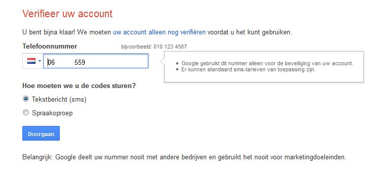 Als het goed is, heb je inmiddels de verificatiecode van Google op je mobiel ontvangen (dat gaat razendsnel). Vul deze code in en klik op Doorgaan.